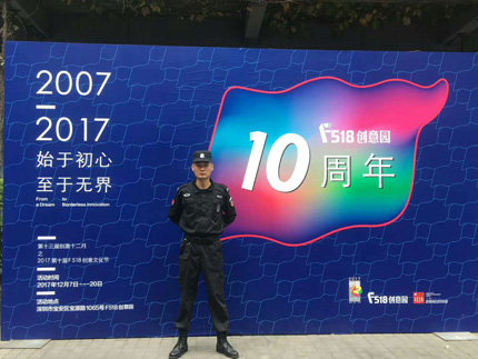 深圳F518時尚創(chuàng)意園是深圳市和寶安區(qū)“十一五”規(guī)劃的重點文化產(chǎn)業(yè)項目,園區(qū)位于寶安中心區(qū)的核心地帶。2007-2017 始于初心 至于無界。我司鐵保宏泰保安參與慶典安全護衛(wèi)。